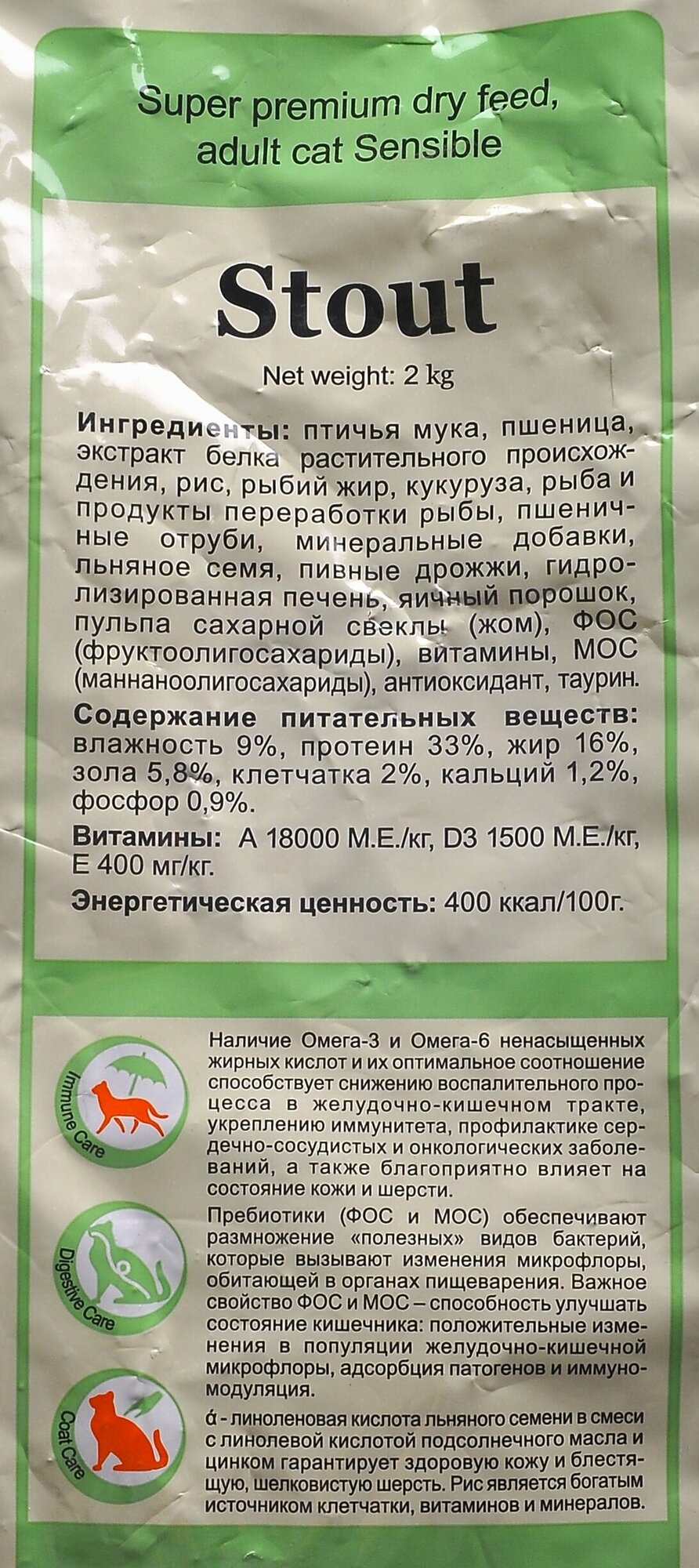Стаут 2кг сухой для взрослых кошек с чувствительным пищеварением (770785)