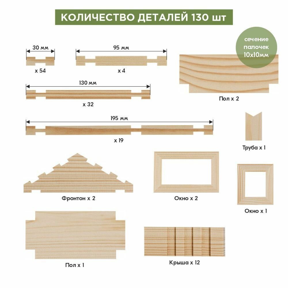 Комплектация | бруски 3 см — 54 шт., бруски 9 см — 4 шт., бруски 13 см — 32 шт., бруски 19 см — 19 шт., большой фронтон крыши — 2 шт., скат крыши — 12 шт., полы (разные) — 3 шт., труба — 1 шт., большое окно — 2 шт., маленькое окно — 1 шт., подробная инструкция |