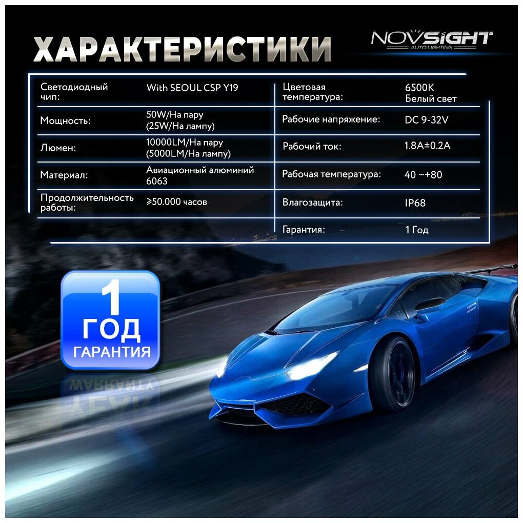 Светодиодная лампа Novsight N15 H4 цоколь P43t 50Вт 2шт 6500К белый свет LED автомобильная информация: