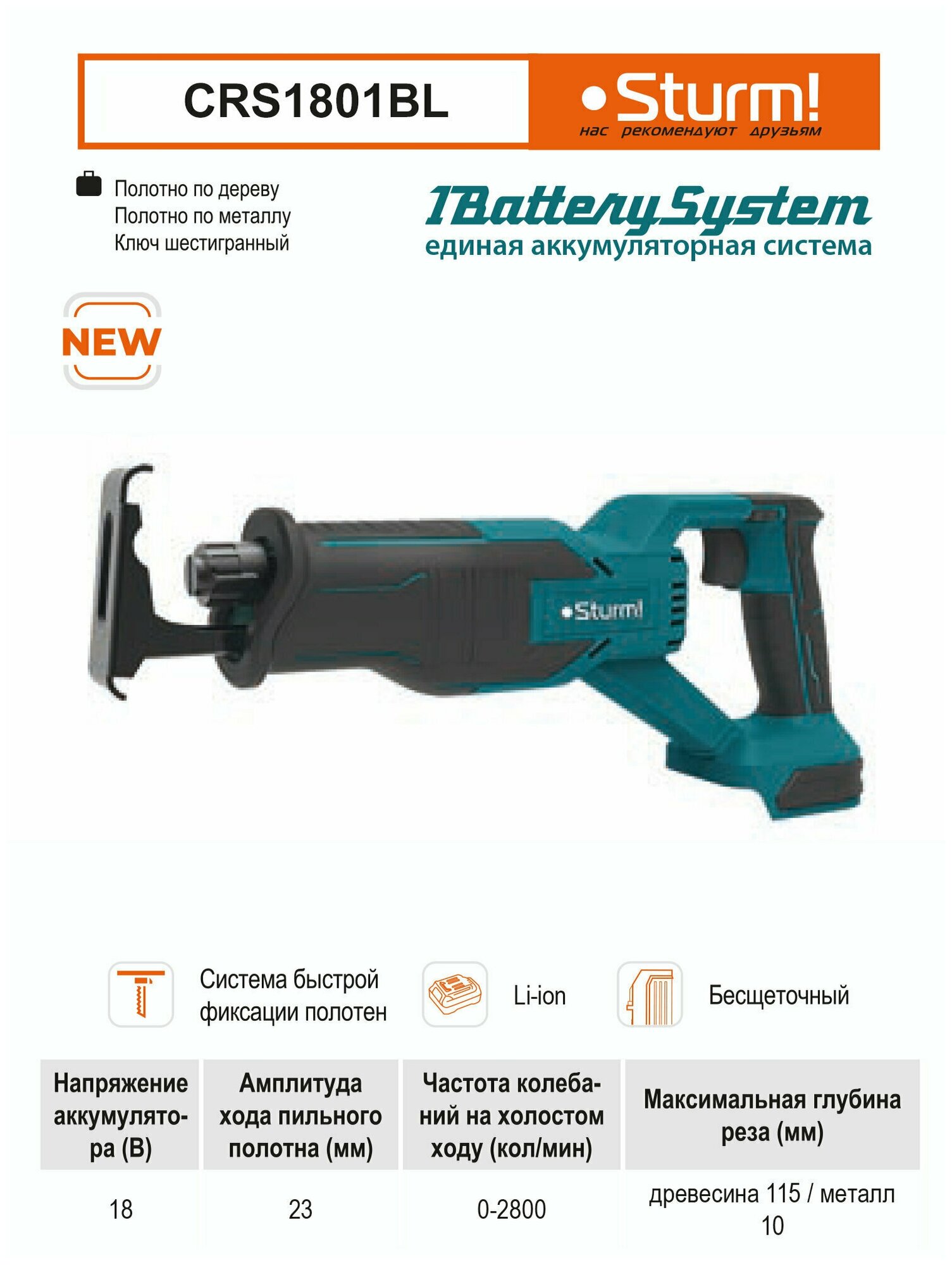 Sturm! Crs1801bl Сабельная пила аккумуляторная б/щ 18 В,1BatterySystem, рез115 мм, без АКБ и ЗУ .