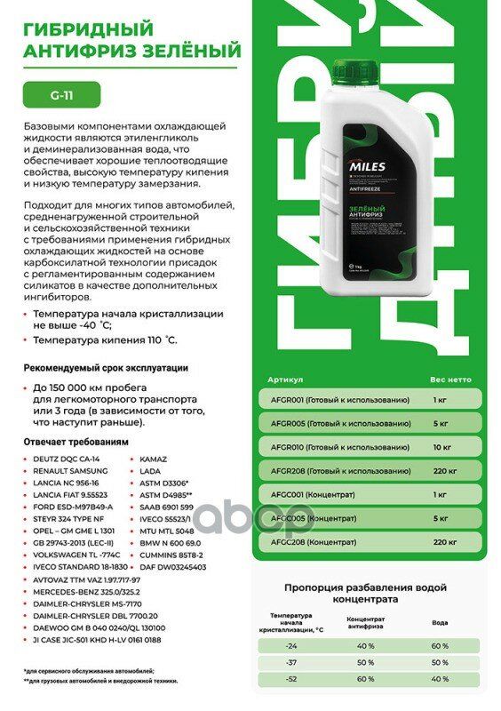 10 цен на Антифриз Концентрат G11 (Зеленый) 5Кг Afgc005 Miles арт. AFGC005