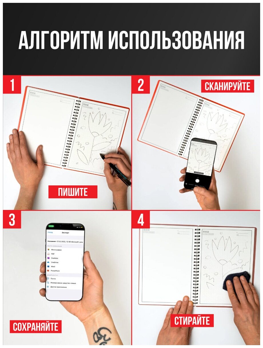 | Комплектация | Умный многоразовый блокнот на пружине, тряпочка из микрофибры для очистки страниц, ручка |