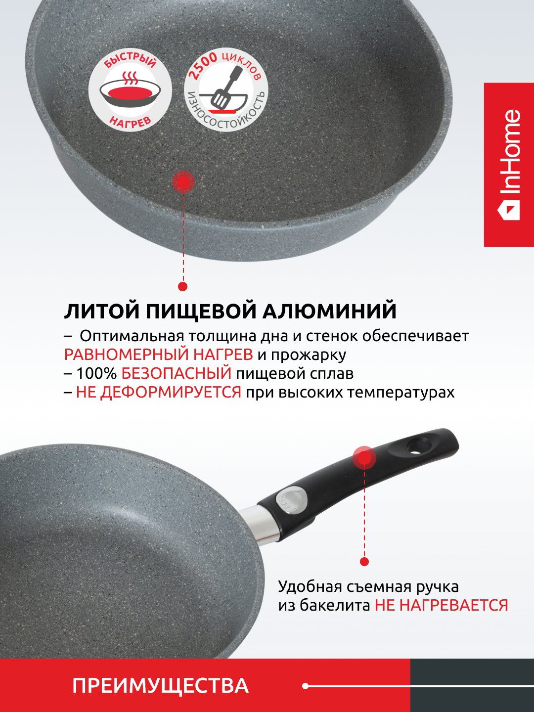 Сковорода InHome классическая литая толстостенная с антипригарным покрытием, съемная ручка