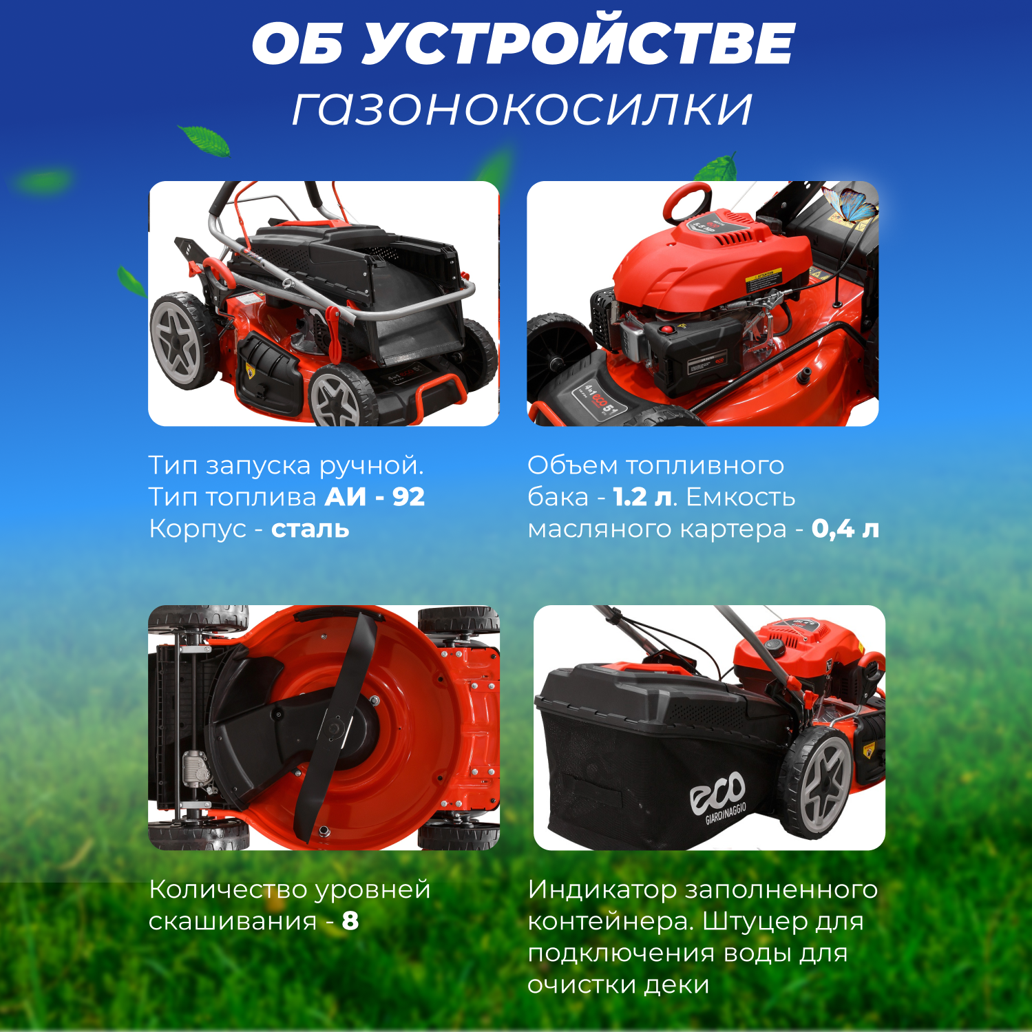 10 цен на Газонокосилка бензиновая ECO LG-734 самоходная (5.5 л.с., шир. 51 см, самоходная, мульчир., стальн.