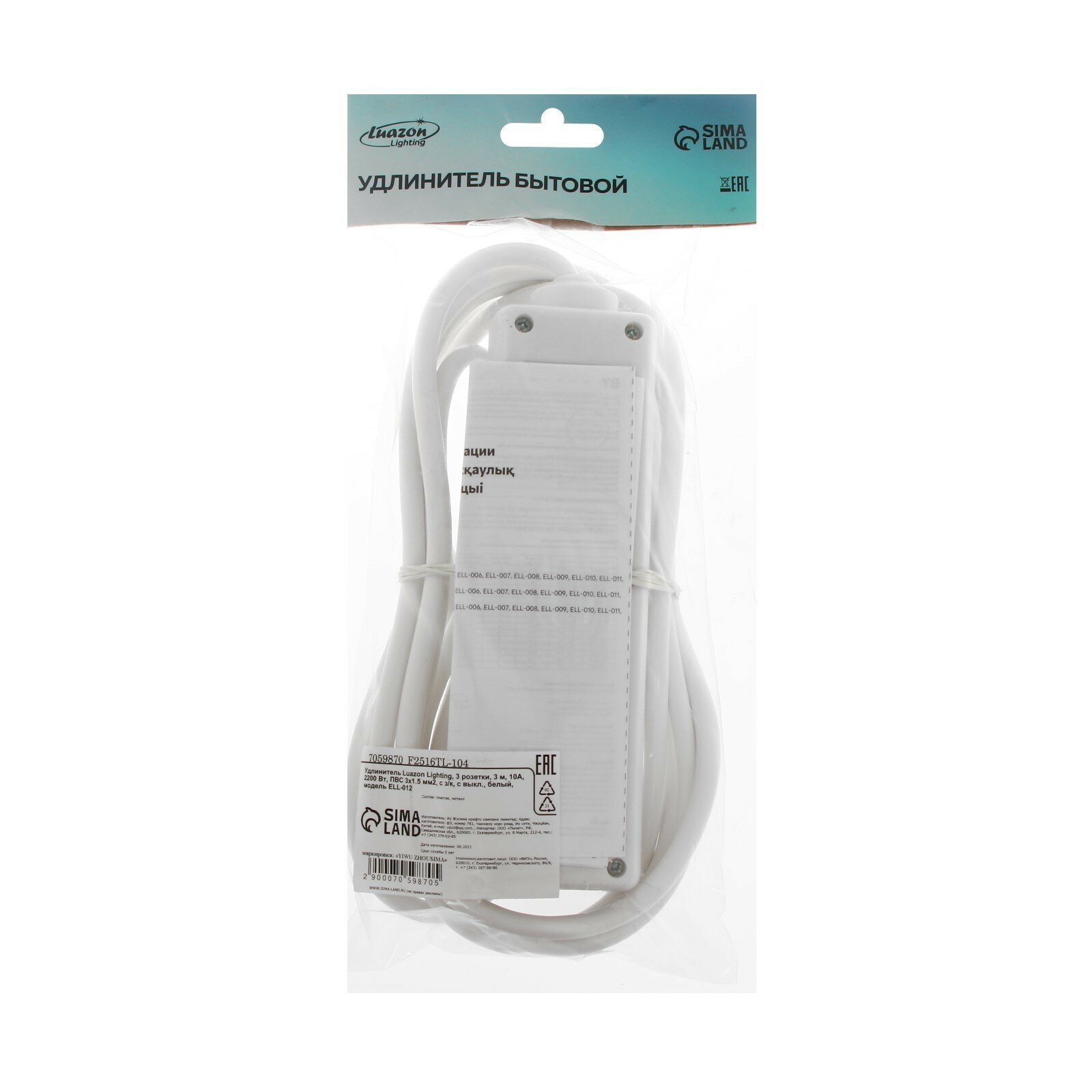 Luazon Lighting Удлинитель 3 розетки, 7 м, 10 А, 2200 Вт, ПВС 3х0.75 мм2, с з/к, белый
