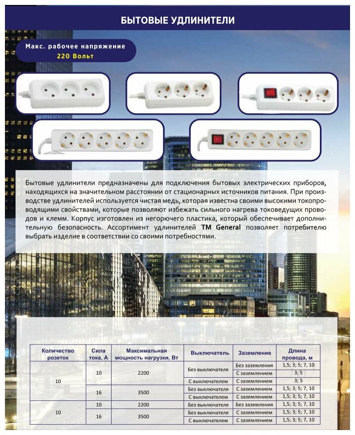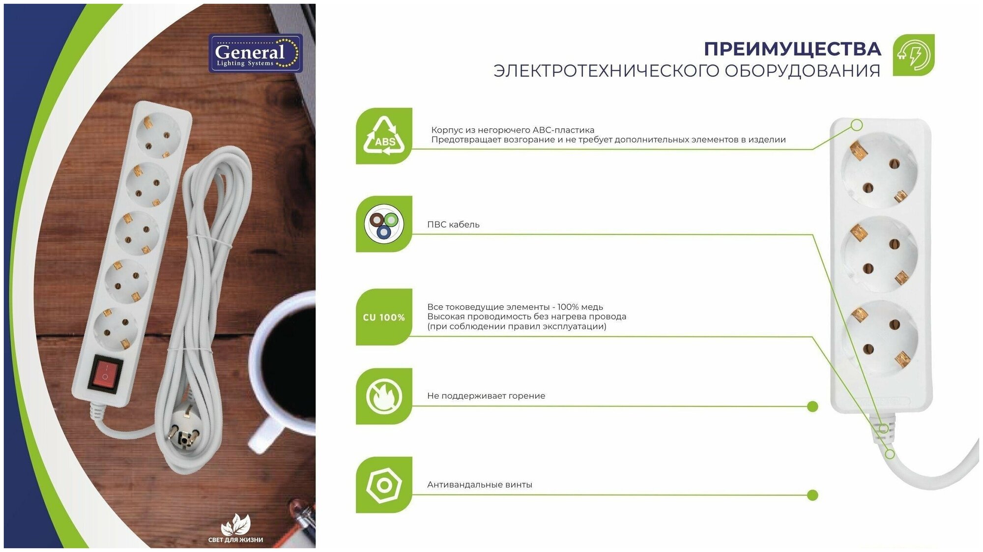 General, Удлинитель бытовой, Количество розеток 5 шт, Длина кабеля 10 м, Питание от сети 220В, Максимальная нагрузка 3500 Вт, IP20, белый