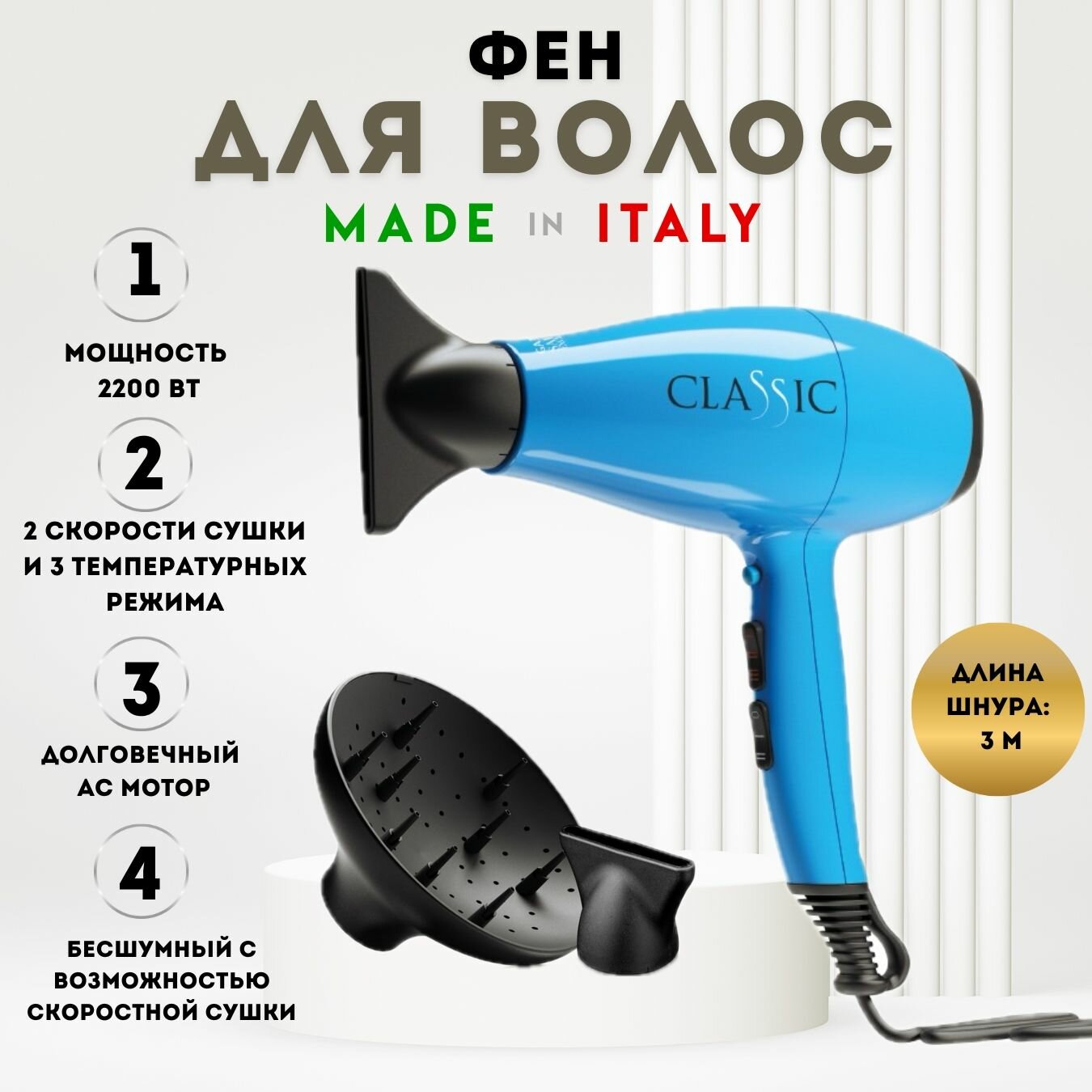 Фен для волос / Фен для волос профессиональный / Фен для волос с насадками GA.MA CLASSIC
