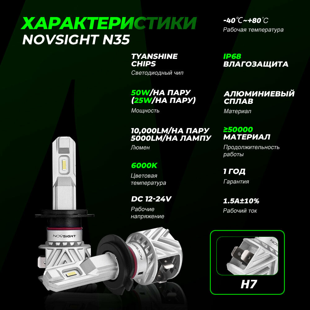 Отзывы на Светодиодная лампа Novsight N35 H7 цоколь PX26d 50Вт 2шт 6000К 10000Лм белый свет LED автомобильная