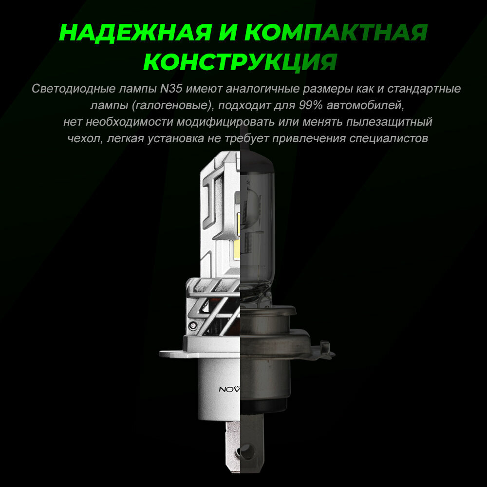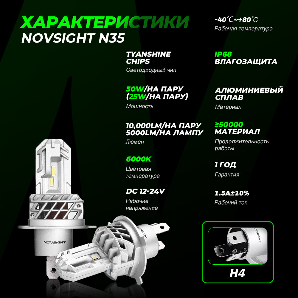 Отзывы на Светодиодная лампа Novsight N35 H4 цоколь P43t 50Вт 2шт 6000К 10000Лм белый свет LED автомобильная