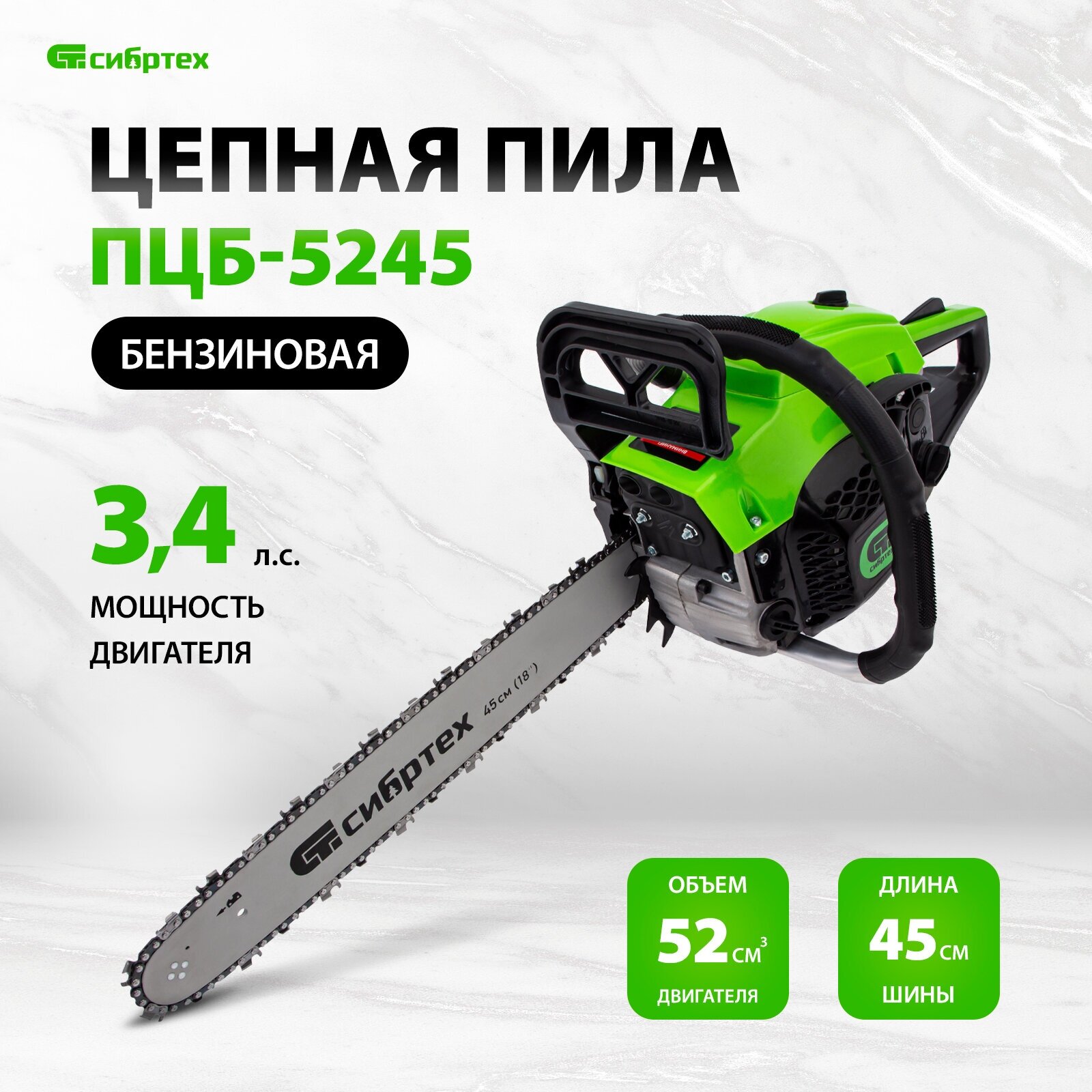Пила цепная бензиновая ПЦБ-5245, шина 45 см, 52 см3, 3.4 л.с, шаг 0.325, паз 1.5 мм, 72 звена Сибртех Сибртех информация: