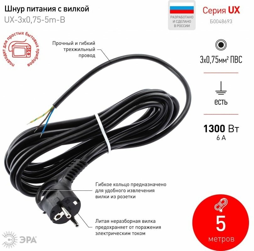 Шнур сетевой с вилкой ЭРА UX-3x0,75-5m-B с заземлением 5м ПВС 3x0,75мм² черный арт. Б0048695 (1 шт.)