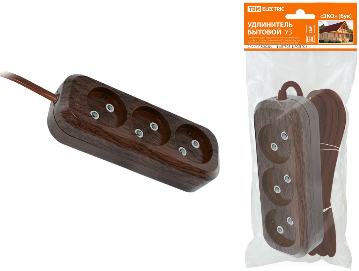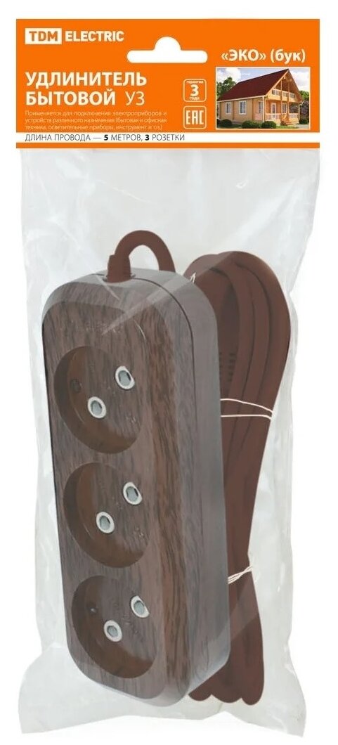 10 цен на Удлинитель бытовой TDM Electric У3 3 гнезда, 5метров,2П б/з, ПВС 2х0,75мм2 "Эко" (бук) 10А/250В .