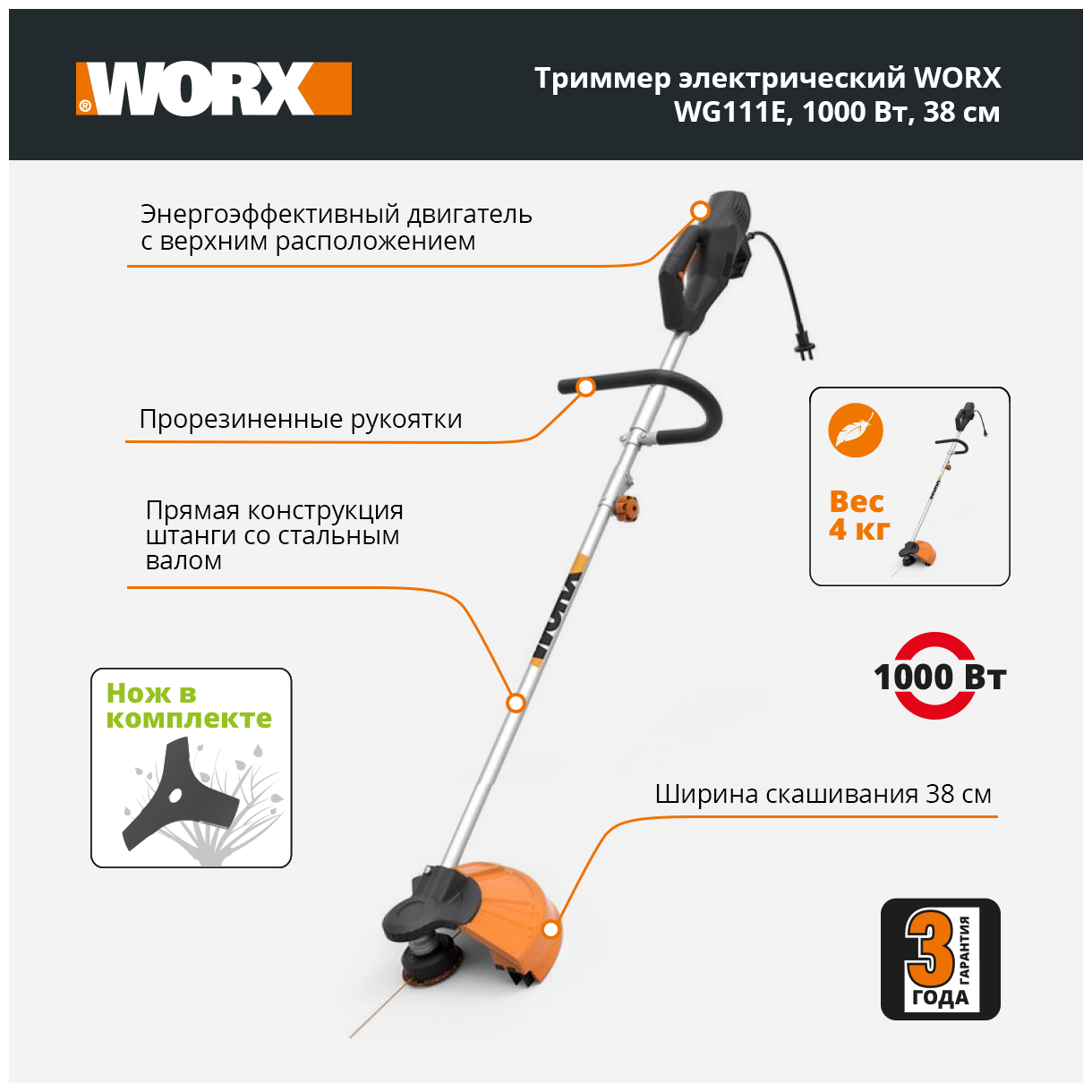 WORX Триммер электрический 220 V 1000 Вт 38 см WG111E информация: