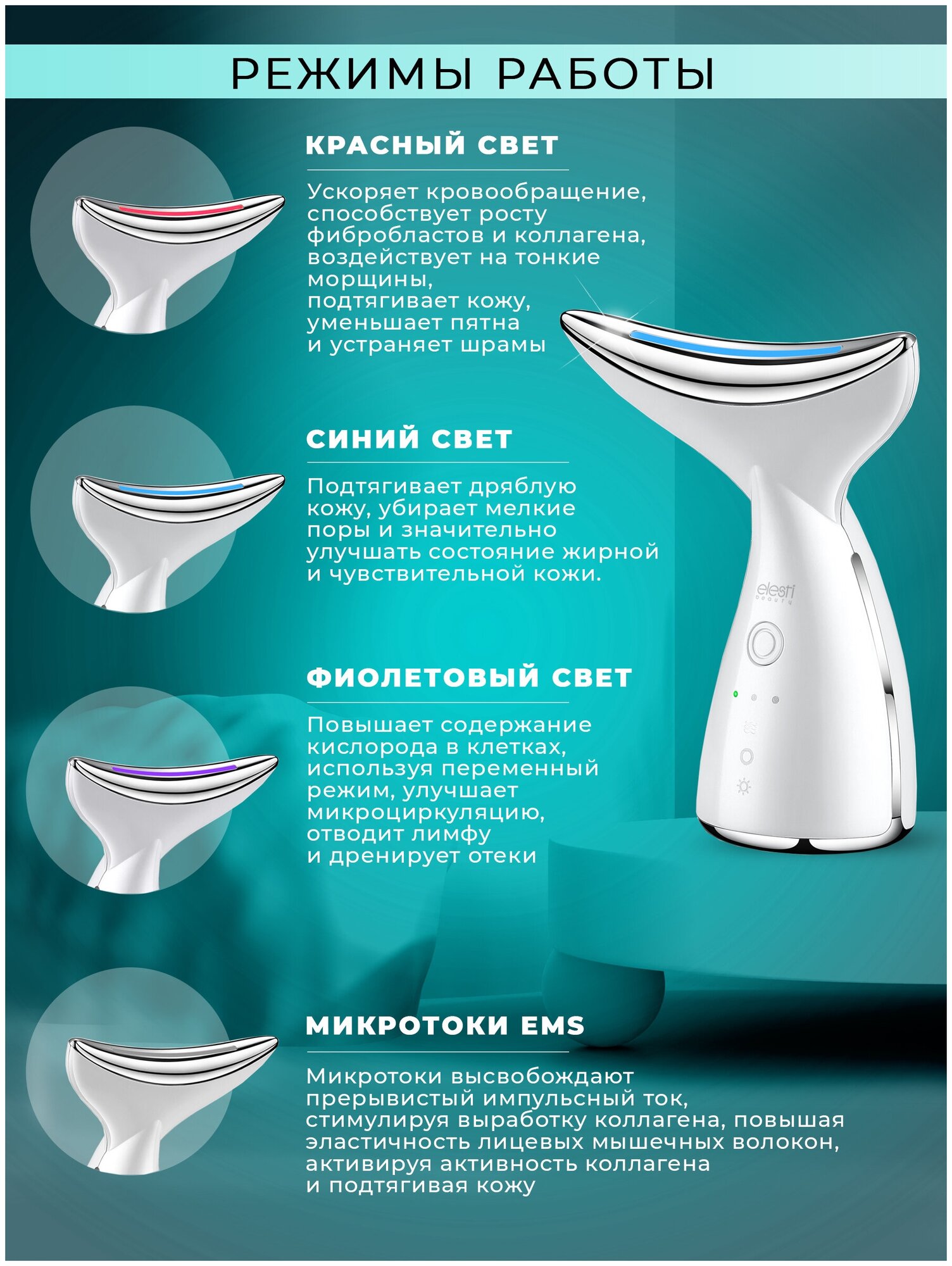 | Принцип работы | вибрация / ионизация / микротоки / светотерапия / нагрев |