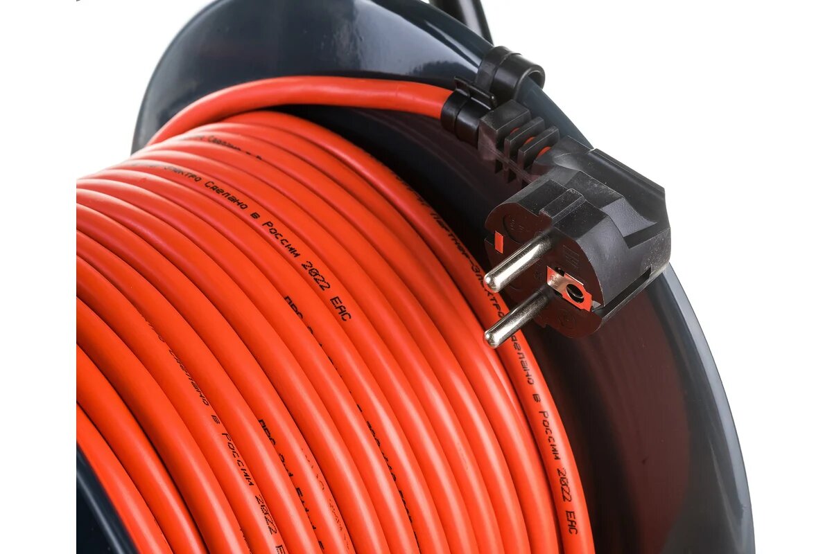 Удлинитель силовой 50 м, 16А, тип УХ10, ПВС, на кабельной катушке, 4 розетки без заземления СибрТех [95865]