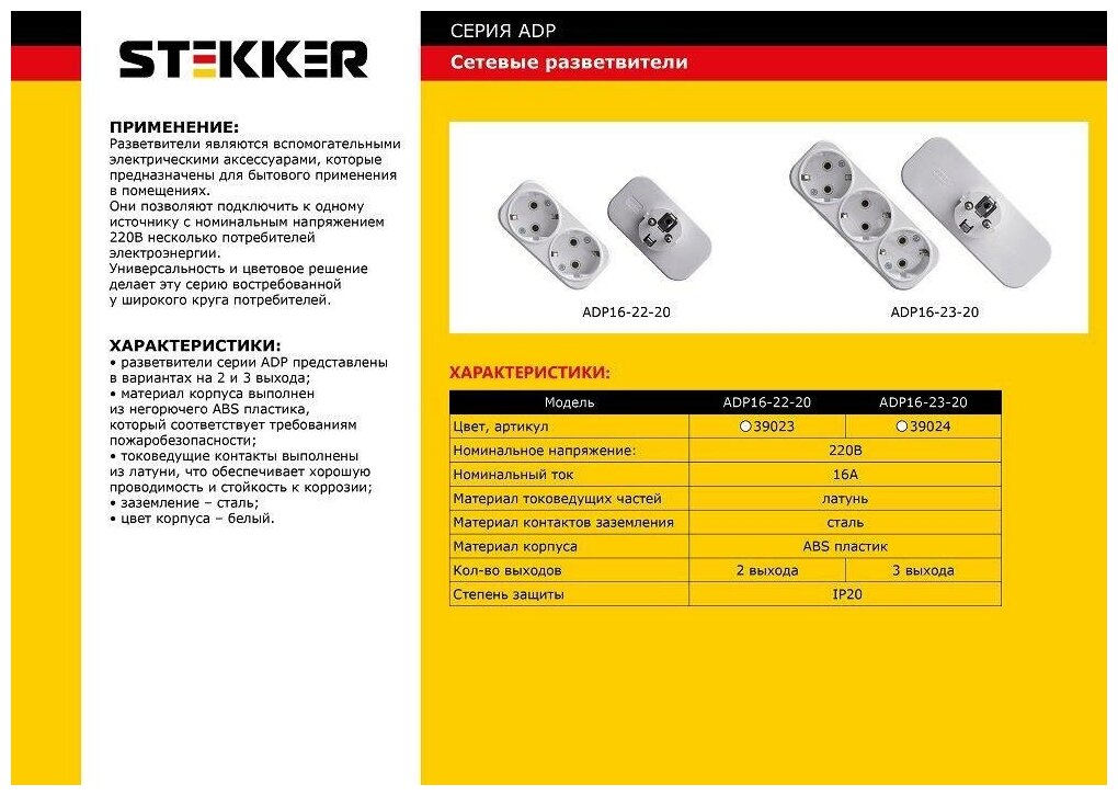 Отзывы на Разветвитель сетевой 3-местный с/з ADP16-23-20, 250V, 16A, ABS пластик, белый, STEKKER 39024 (1 шт.)