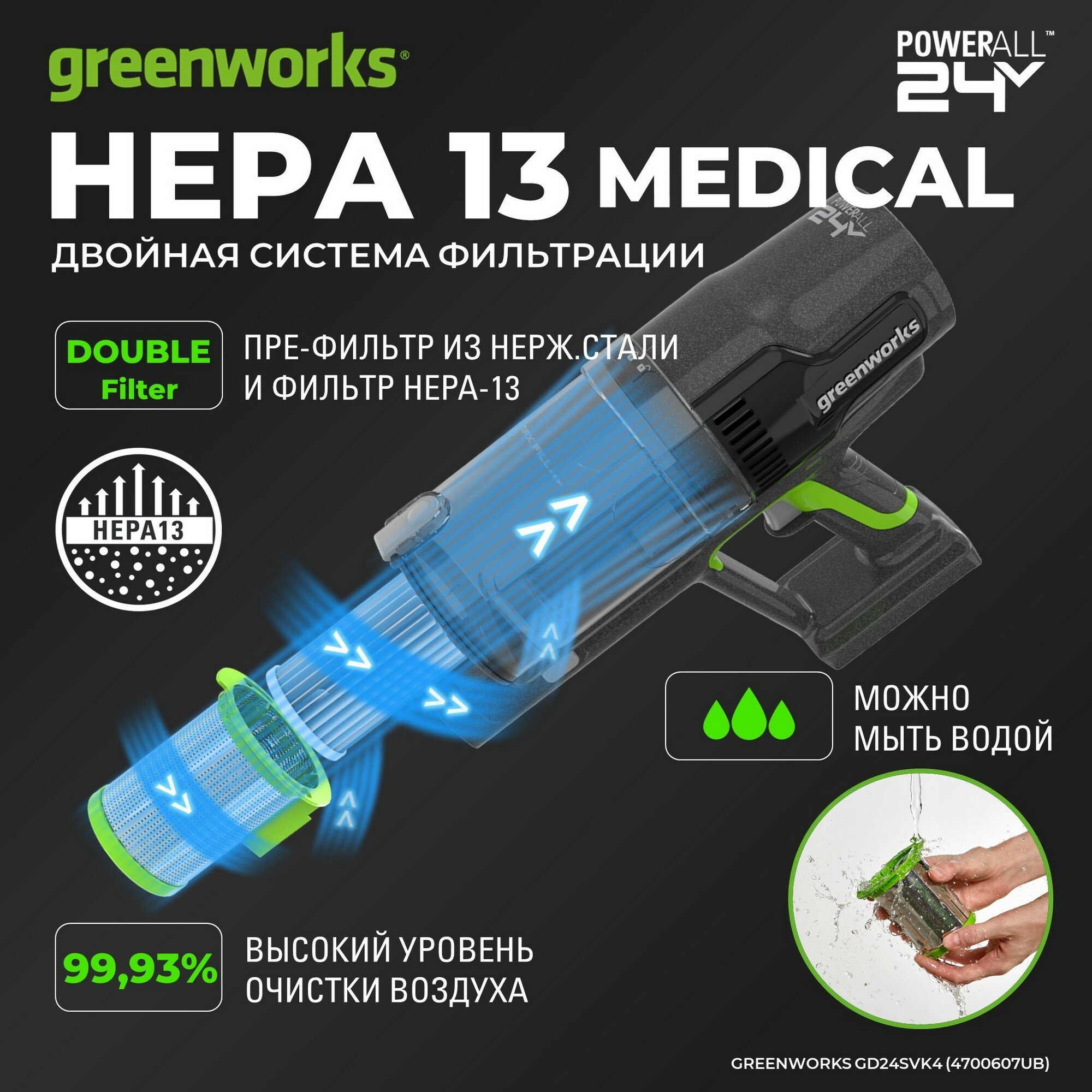 Пылесос беспроводной вертикальный аккумуляторный Greenworks Арт. 4700607UB, 24V, с 1хАКБ 4 Ач и ЗУ информация: