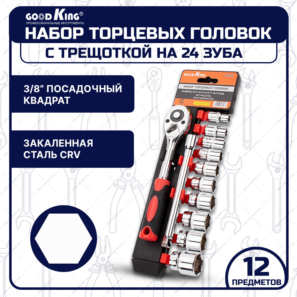 Набор торцевых головок Goodking T-3812, 12 предметов с трещоткой 3/8 дюйма и удлинителем информация:
