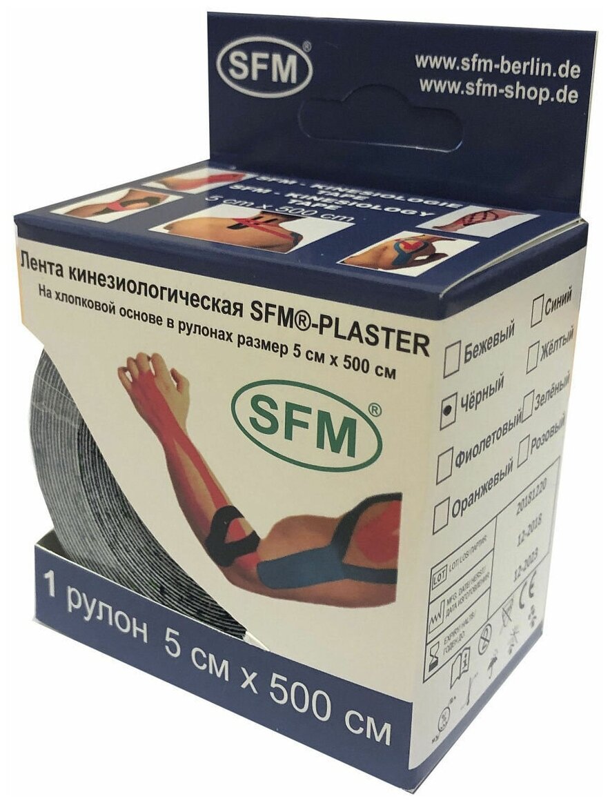 Лента кинезиологическая SFM-Plaster, на хлопковой основе, 5см Х 500см, синего цвета, в диспенсере информация: