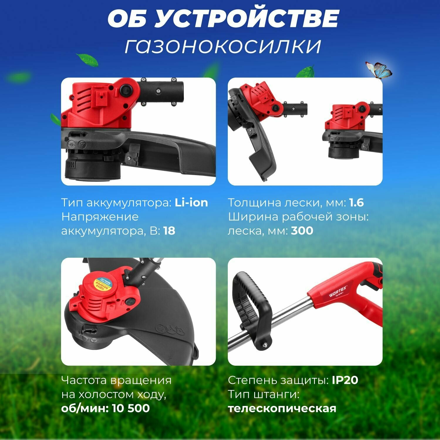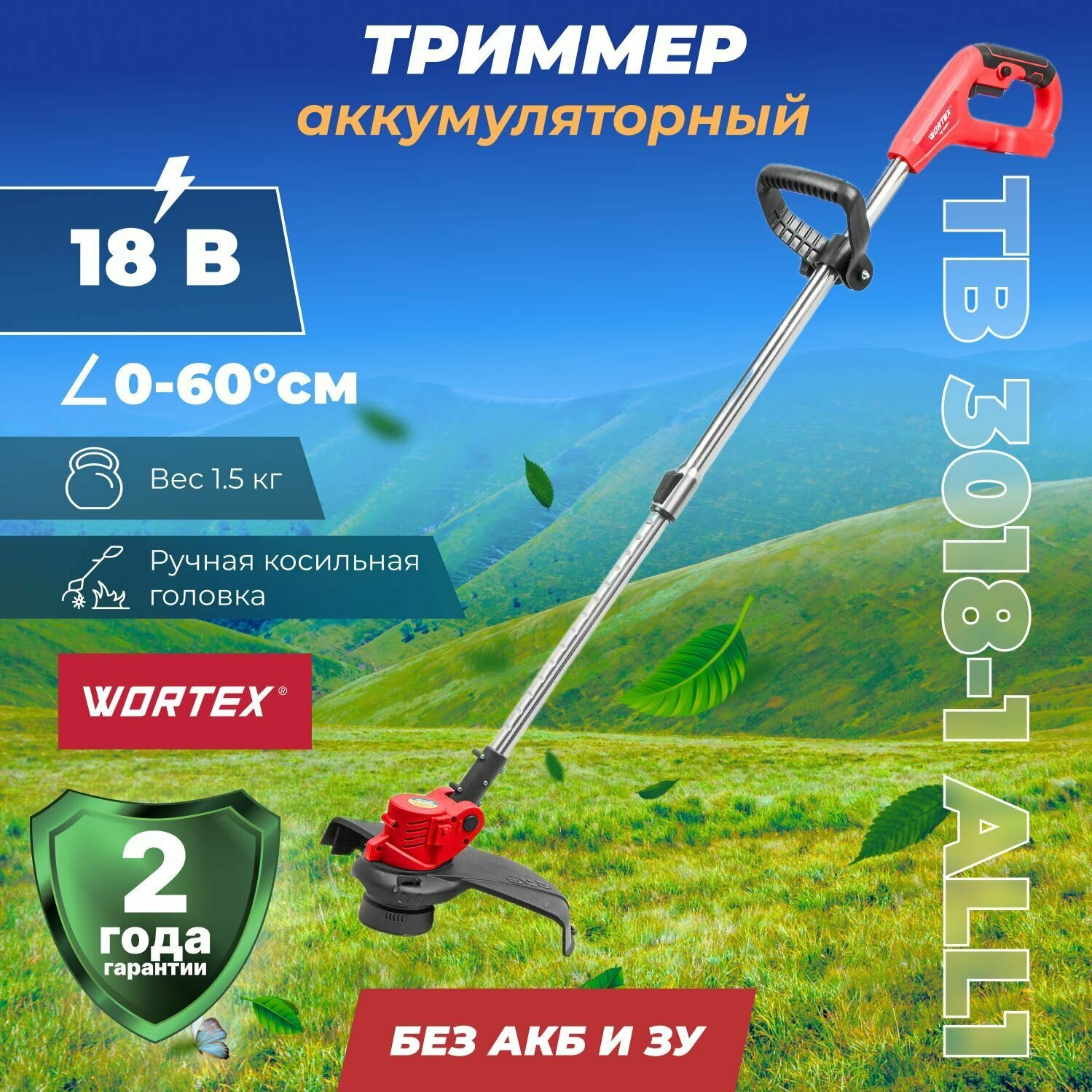 Триммер аккум. WORTEX TB 3018-1 с акб и зу ALL1 (18 В, телескоп.ручка, рег.угол 0-60°, 1.6 мм леска, c АКБ И ЗУ) (0333242)