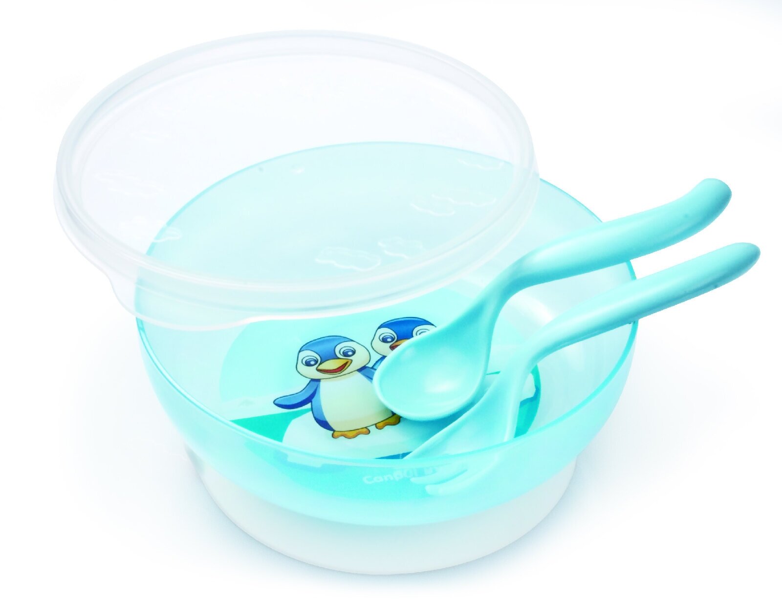 Набор для кормления Canpol Babies миска с крышкой, вилкой и ложкой Голубой, тарелка на присоске с кружкой