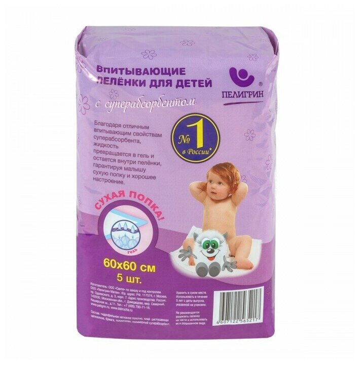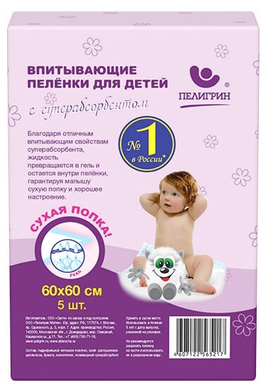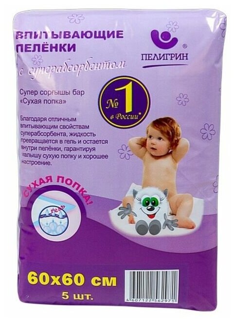 Одноразовая пеленка Пелигрин с суперабсорбентом 60х60, 5 шт. информация: