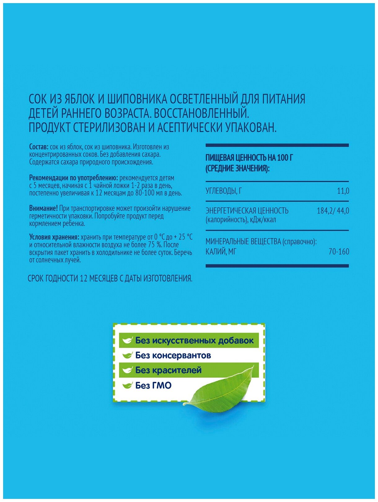 ФрутоНяня 0,2л. Сок из яблок и шиповника осветл./18шт. информация: