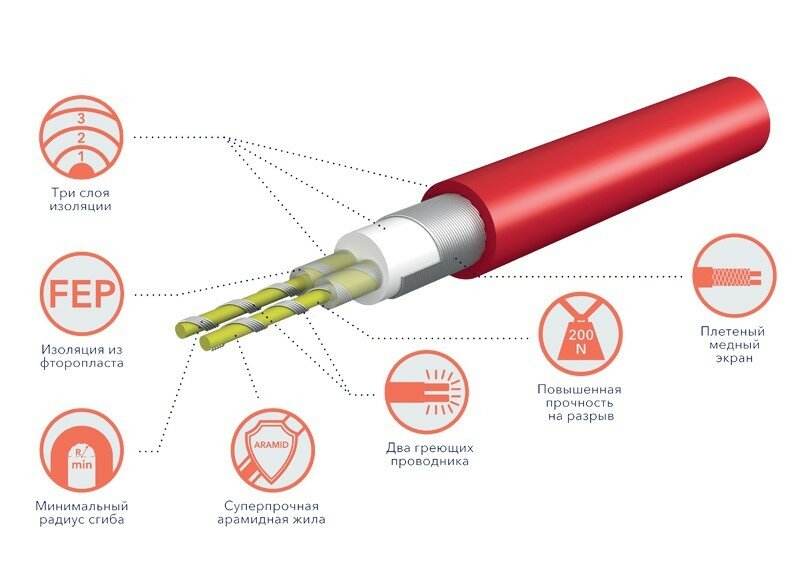 | Дополнительная информация | три слоя изоляции; повышенная прочность на разрыв; два греющих проводника; степень защиты IPX7; толщина мата 3.5 мм; шаг укладки кабеля 7.4 см; сопротивление 645.3 Ом |