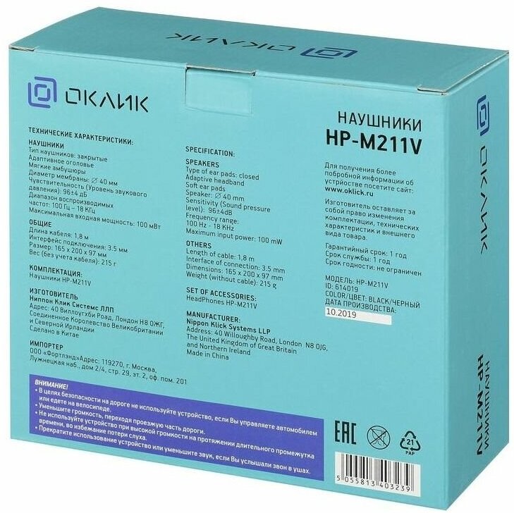 Наушники OKLICK HP-M211VB, проводные, черные информация: