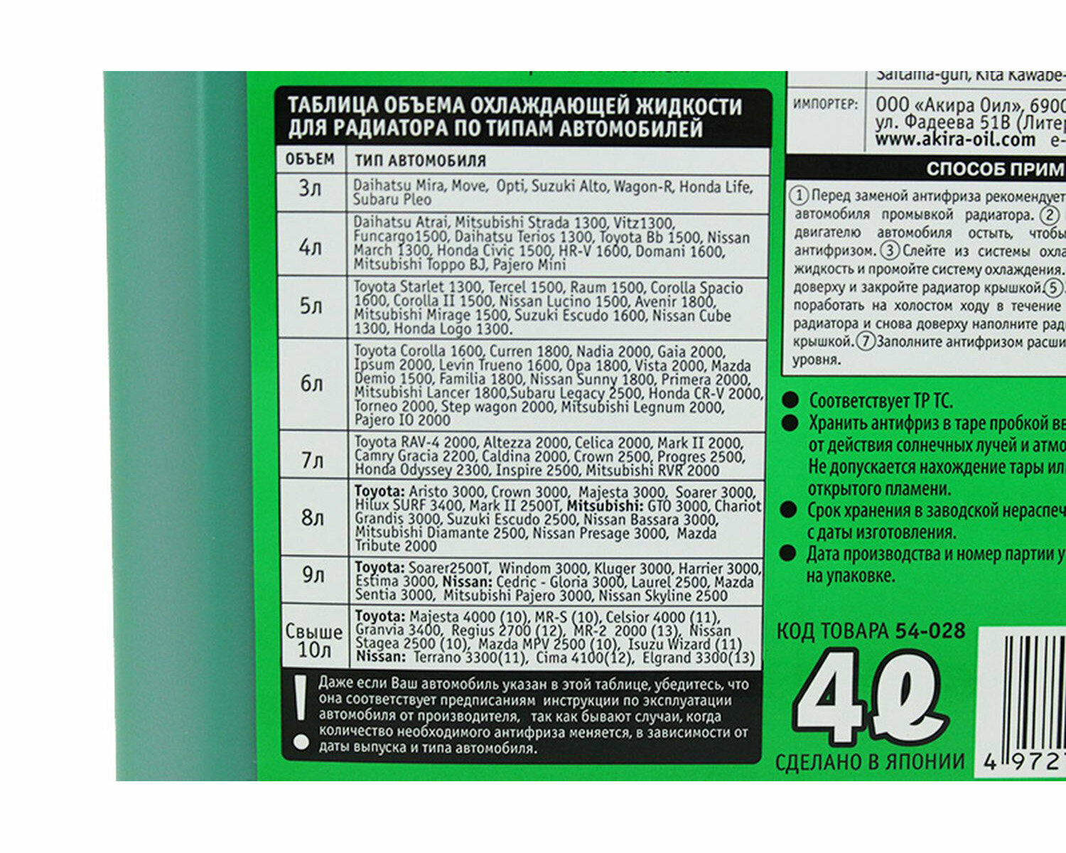 Антифриз AKIRA зеленый готовый 4л информация: