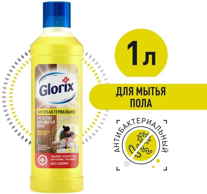 Glorix Средство для мытья пола дезинфицирующее 1 л GLORIX (Глорикс) "Лимонная Энергия", без хлора, 8677296 (цена за 1 ед.товара)