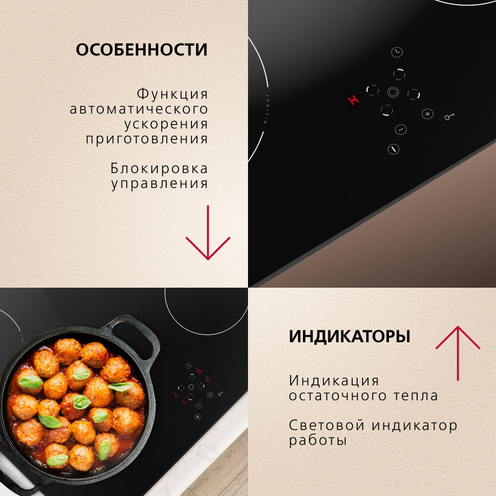 | Безопасность | защитное отключение конфорок / кнопка блокировки панели / индикатор остаточного тепла |