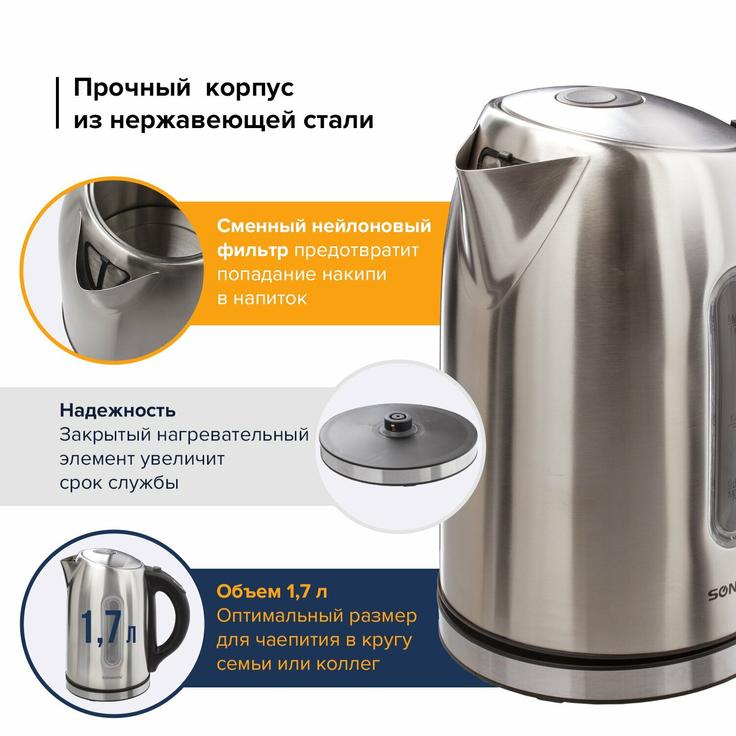 Отзывы на Чайник SONNEN KT-1740, 1,7 л, 2200 Вт, закрытый нагревательный элемент, терморегулятор, нержавеющая сталь, 453 453421
