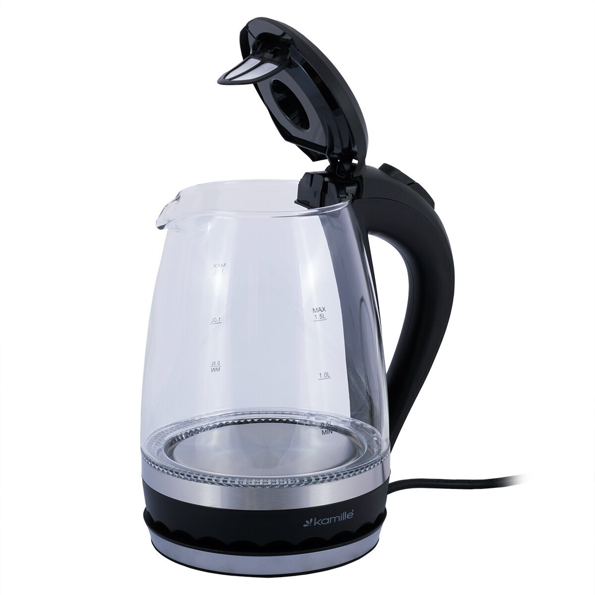 10 цен на Чайник электрический 1,5 л. стеклянный Kamille KM-1701B (черный) с синей LED подсветкой