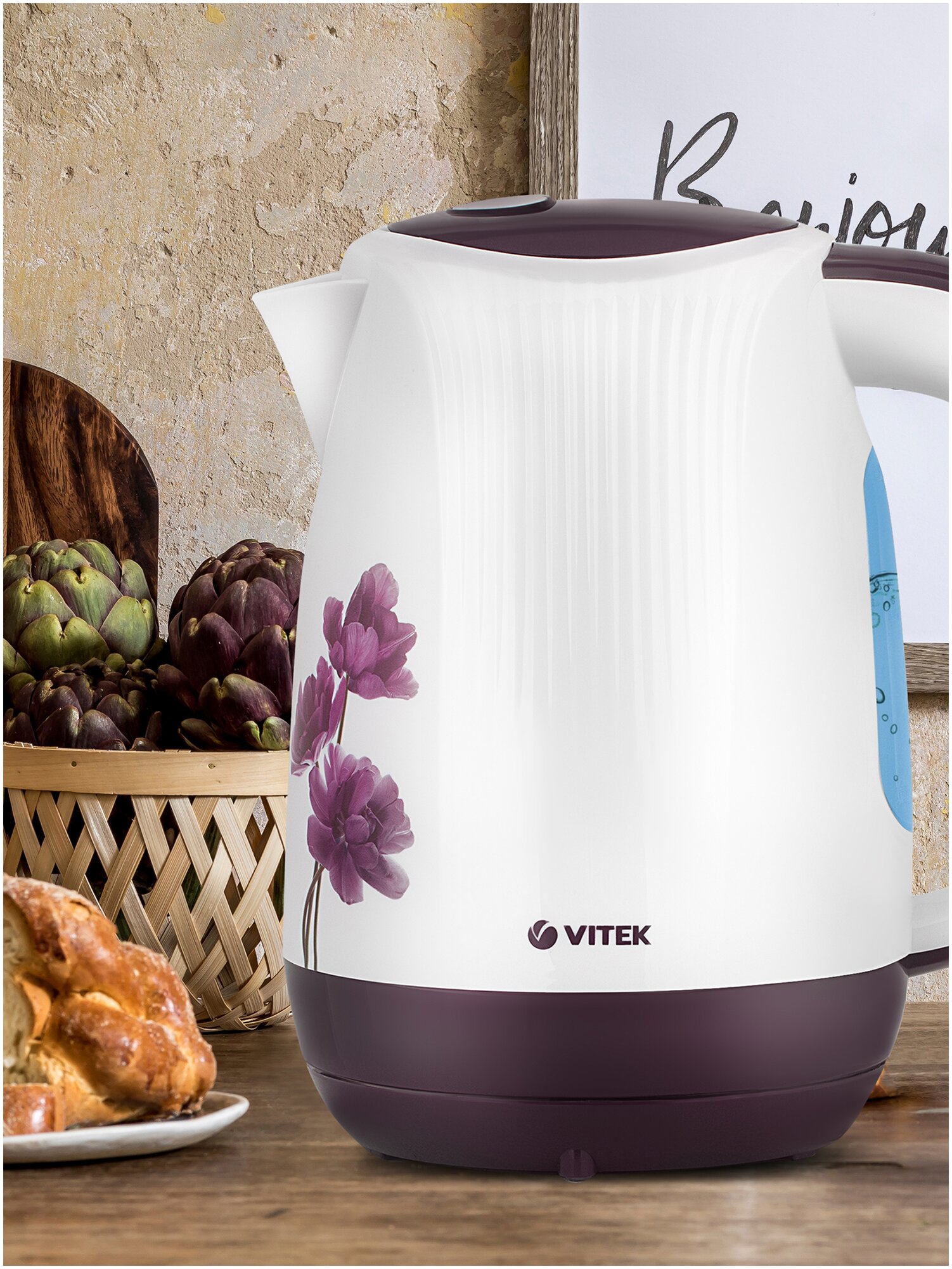 Чайник электрический VITEK VT-7061, 2200Вт, белый с узором и фиолетовый информация: