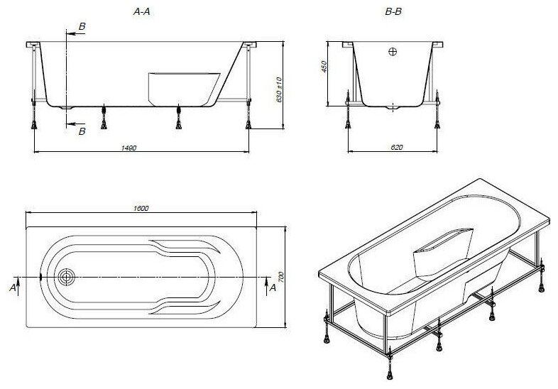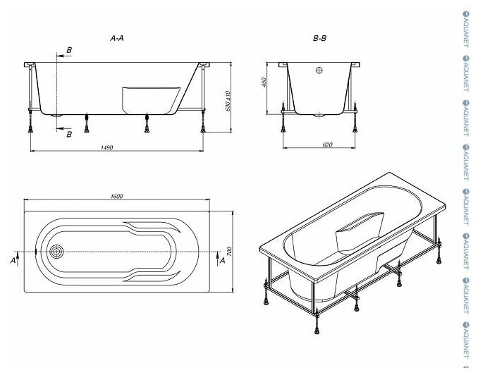 Акриловая ванна ARAGUT Кама 160х70 прямоугольная, в комплекте с каркасом, белая