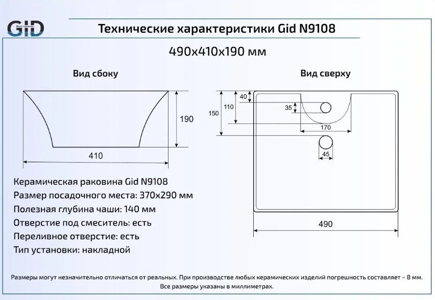Раковина накладная (49х41) Gid N9108 7 595 ₽