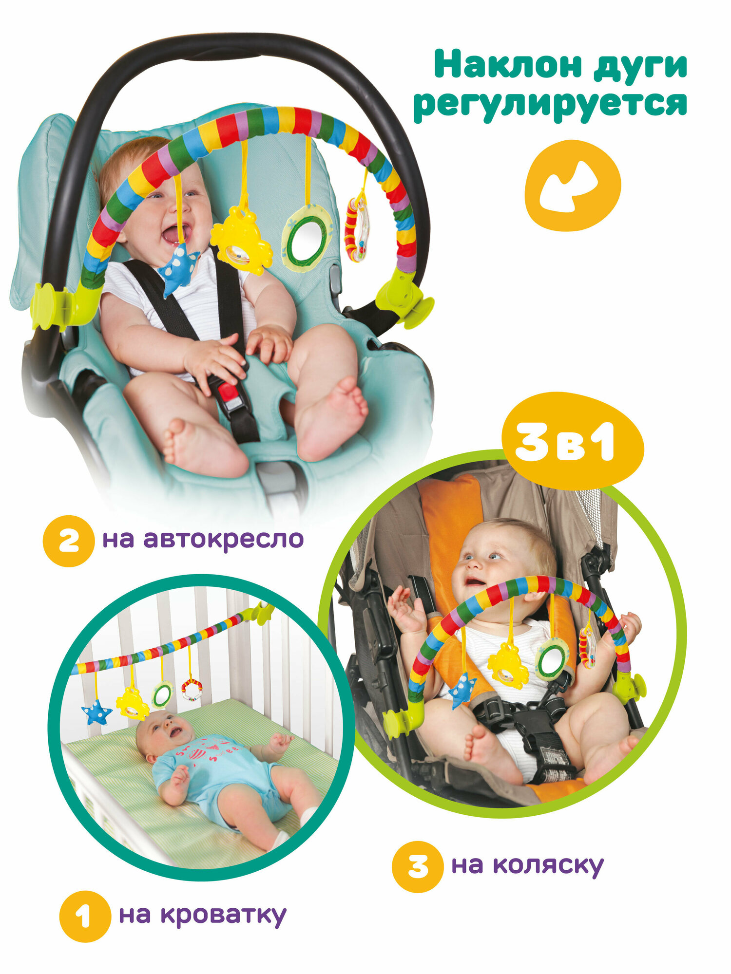Дуга с подвесками "Забава": 4 игр. крепл. прищепка, 3в1 кроват., коляс., автокрес. 1 241 ₽