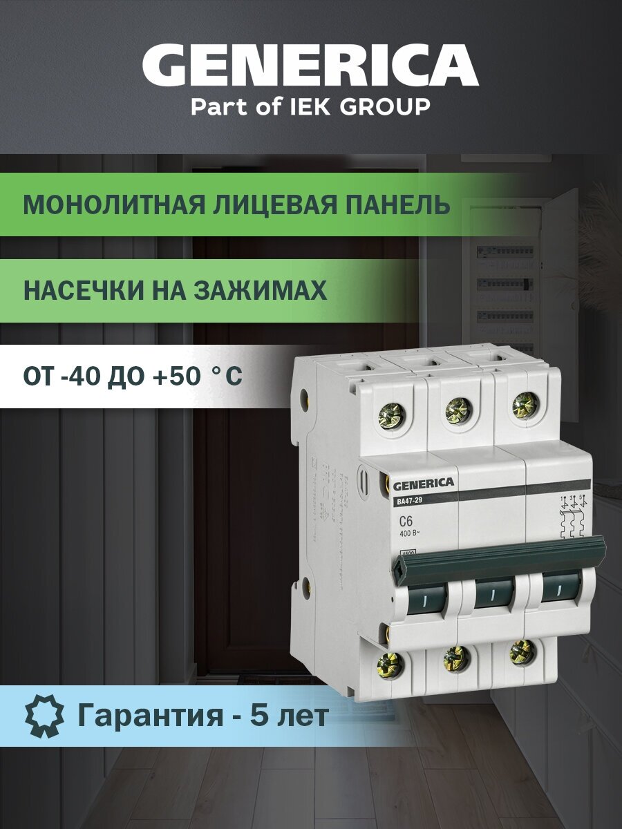 Выключатель автоматический трехполюсный ВА47-29 6А C 4,5кА GENERICA. MVA25-3-006-C IEK