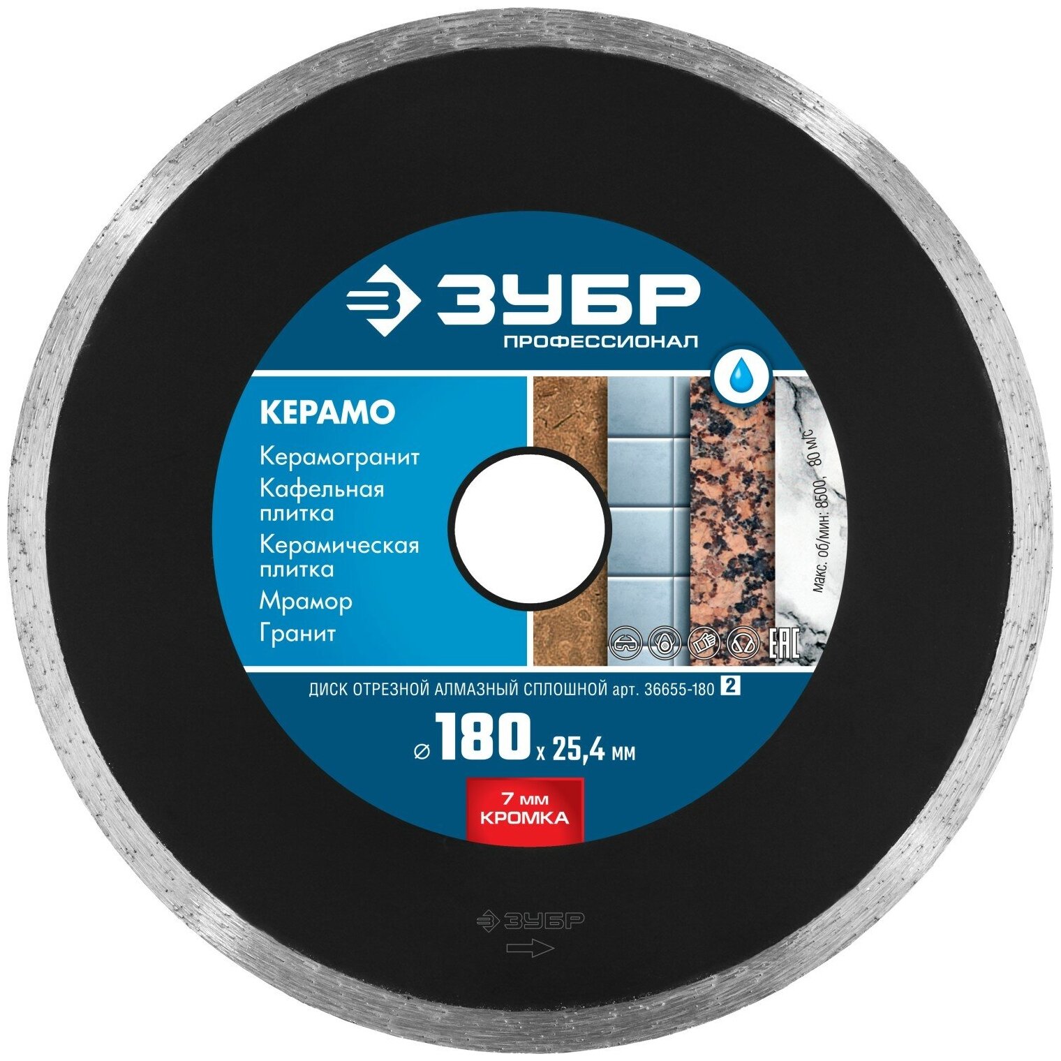 Зубр КЕРАМО-25 180 мм диск алм отр. сплошной по КЕРАМО-25граниту мрамору плитке Проф 36655-180_z02