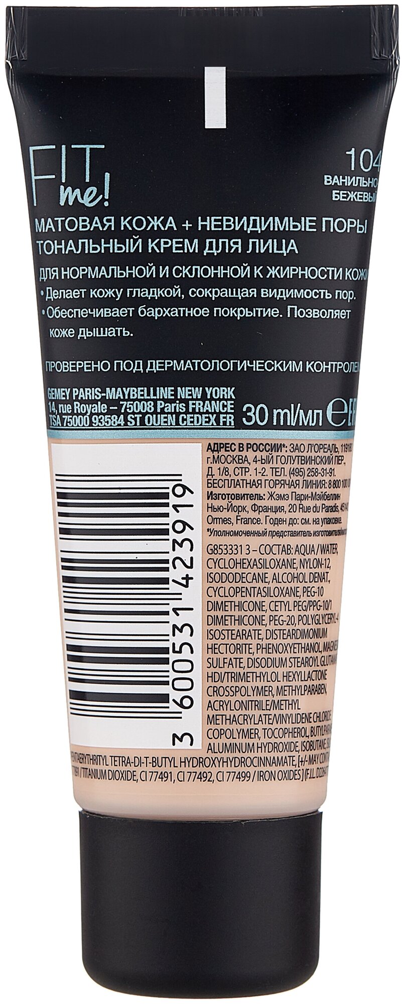 Maybelline New York Тональный крем Fit Me, 30 мл/30 г, оттенок: 104 ванильно-бежевый, 1 шт. информация: