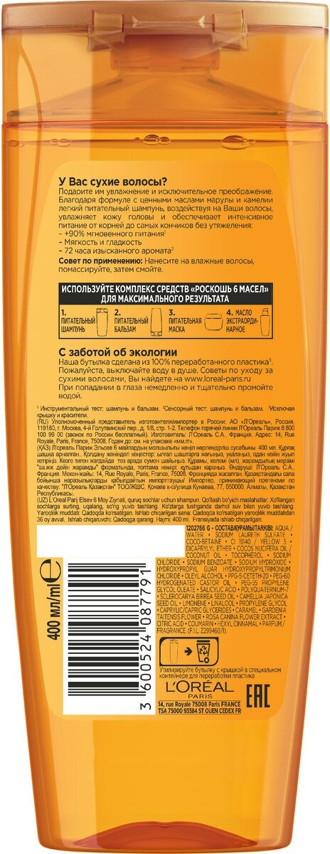 L'OREAL PARIS Elseve Роскошь 6 Масел Шампунь для волос питательный с маслами марулы и камелии 400 мл. информация: