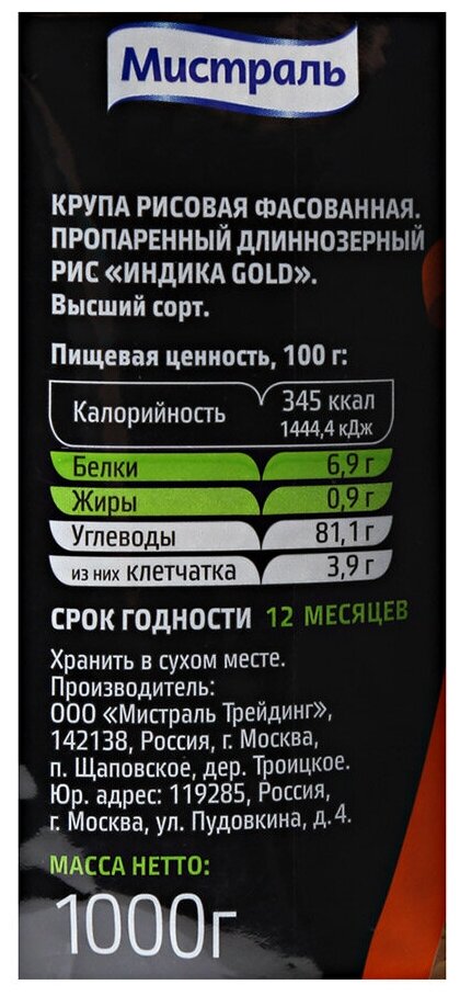 Рис Мистраль Индика Gold длиннозерный пропаренный, 1 кг информация:
