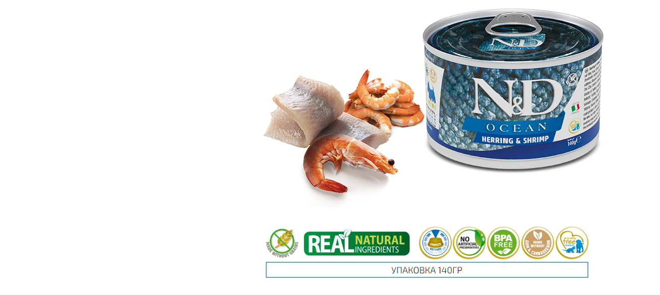 10 цен на Фармина 02215 N&D OCEAN кон.д/собак мелких пород Сельдь с креветками 140г