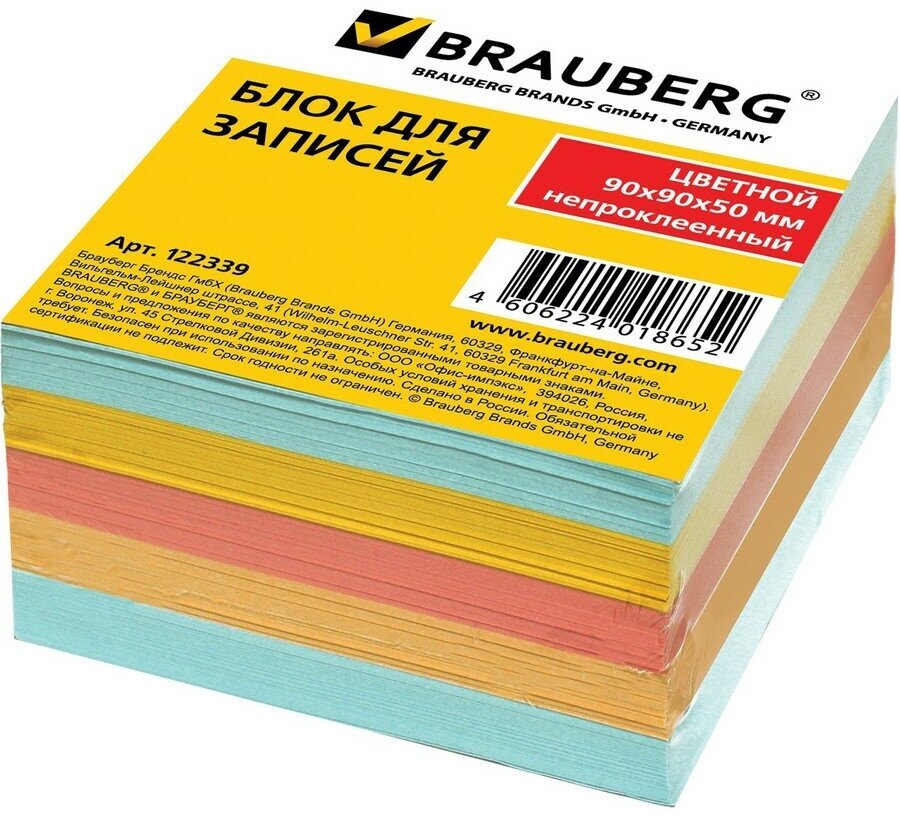 Блок-кубик для записей Brauberg, 90x90x50мм, непроклеенный, цветной (122339) информация: