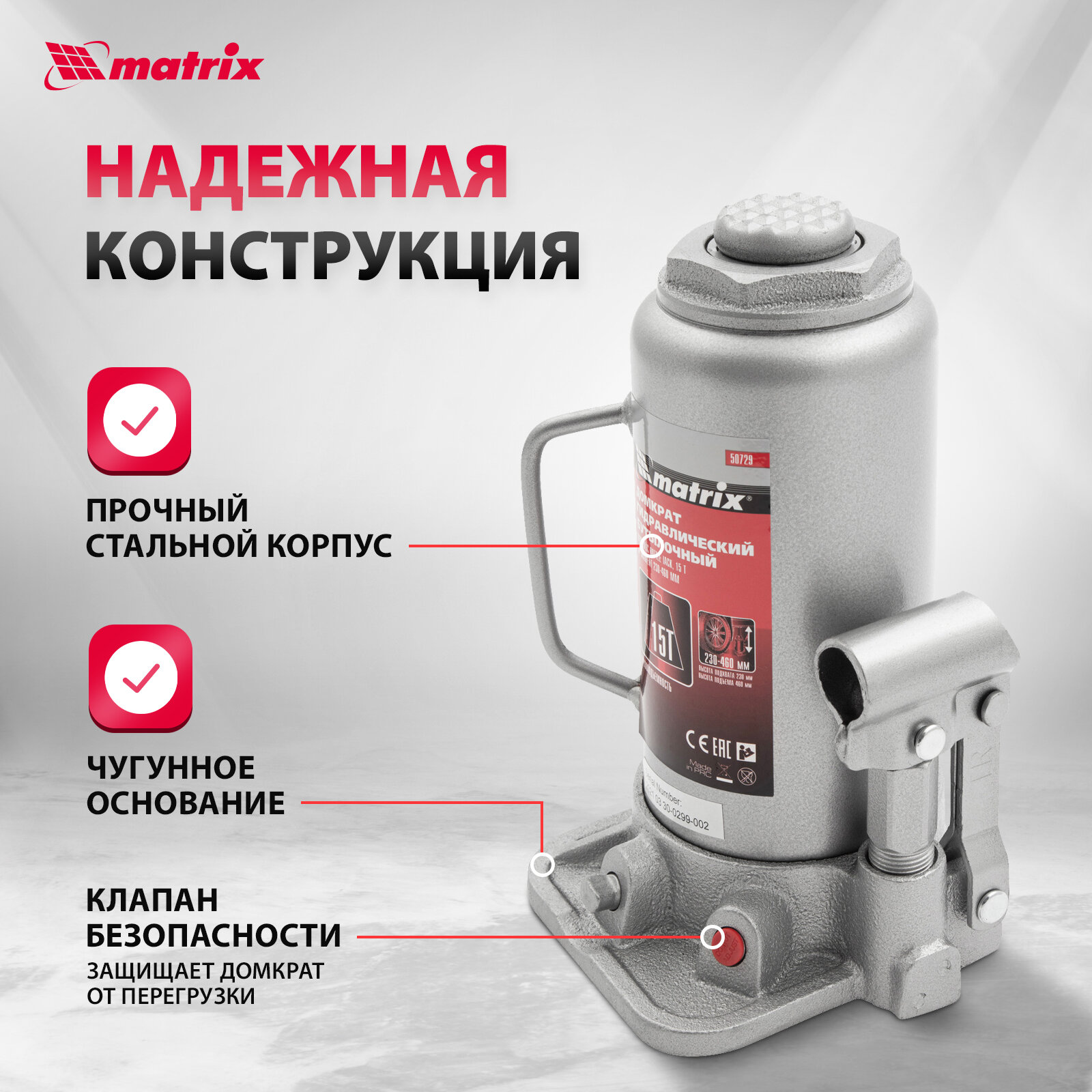 Отзывы на MATRIX 50729 Домкрат гидравлический бутылочный, 15 т, h подъема 230-460 мм MATRIX 50729
