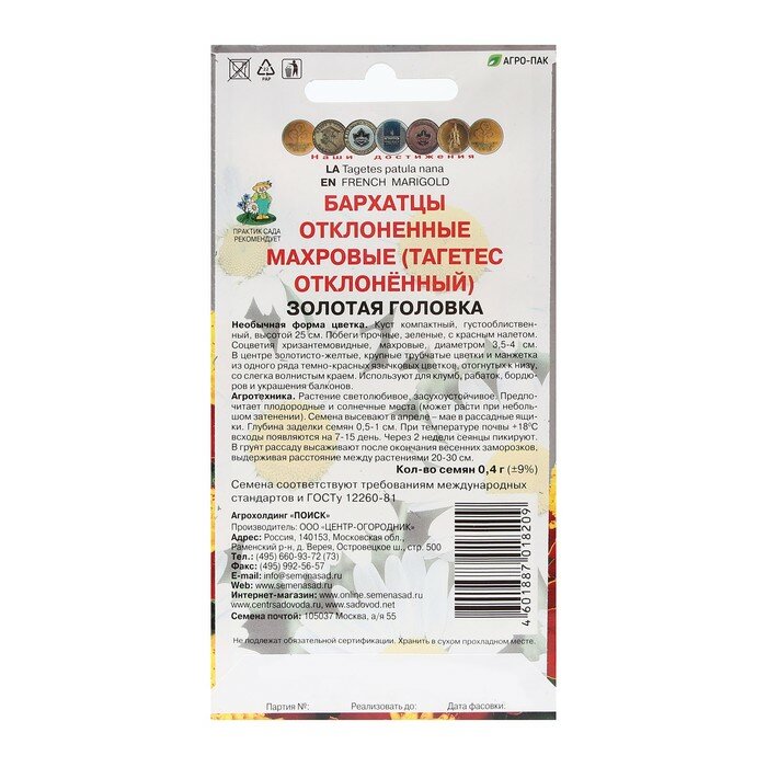 Семена цветов Бархатцы отклоненные махровые "Золотая головка" 0,4 г (4 шт) информация: