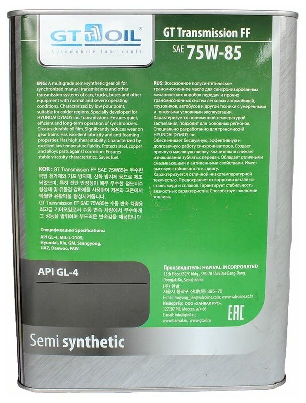 Уценка масло трансмиссионное 75w85 gt oil 4л полусинт gt transmission ff gl-4, gt oil, 8809059407806ucn