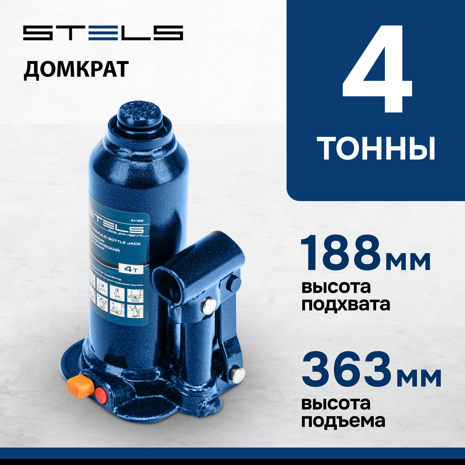 Домкрат бутылочный гидравлический Stels 51162 (4 т) синий