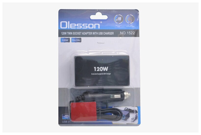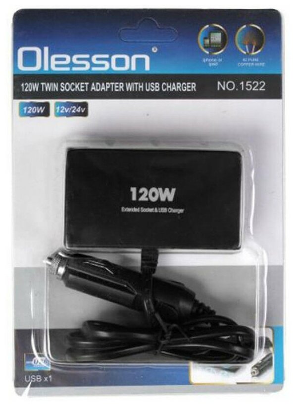 OLESSON OLS-1522B Разветвитель прикуривателя 2-х гнездовой 12-24V 1USB 1.2А с удлинителем 0.8м черный OLESSON